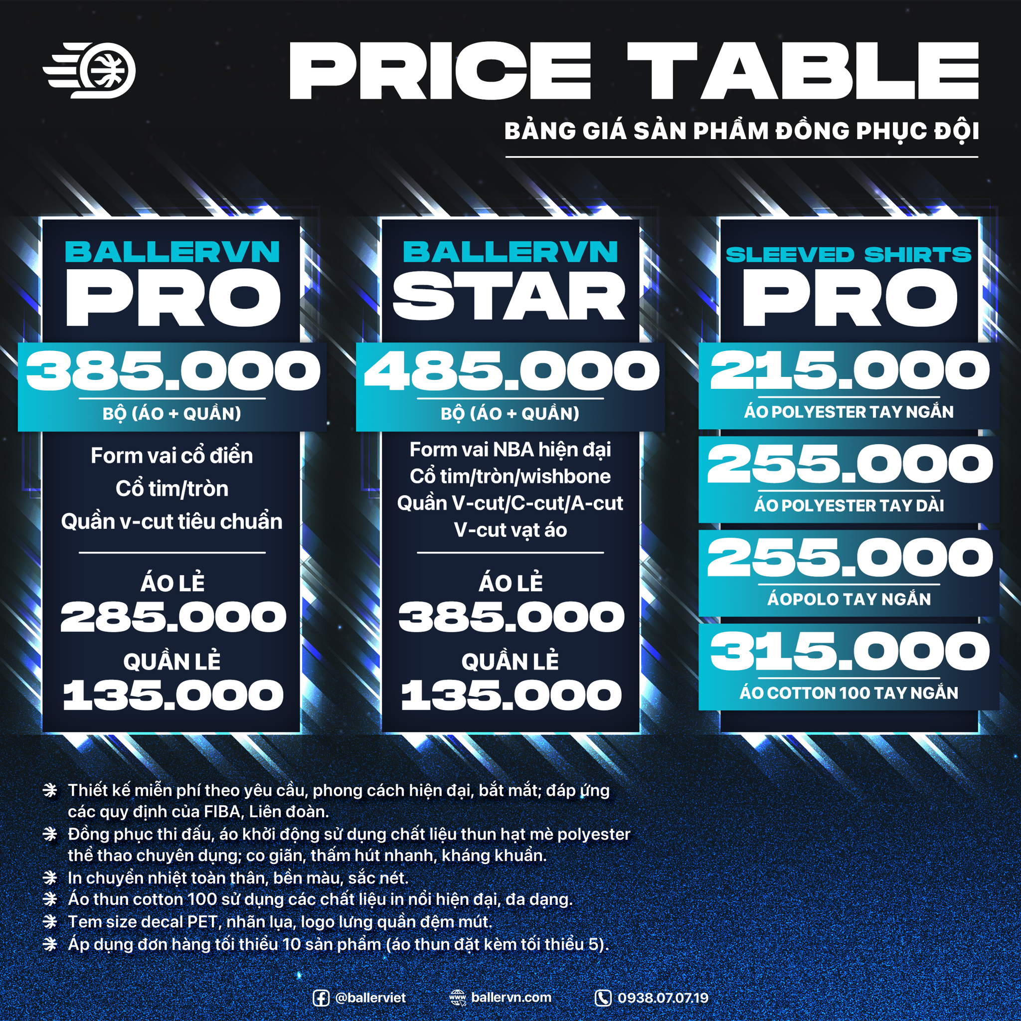 Giá cả phụ thuộc vào: chất liệu vải, thiết kế mẫu mã, số lượng in ấn. Ballervn cam kết giá cả phù hợp với chất lượng sản phẩm.